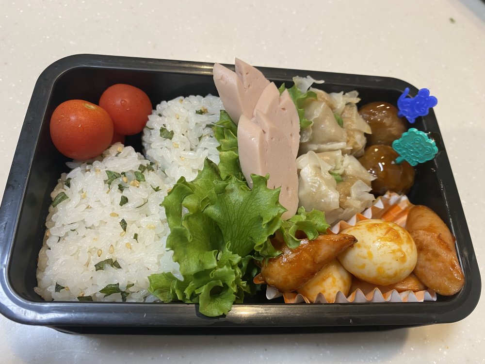 ハムカツのおにぎらず+とりの照り焼き+ピーマンに油揚げ、じゃこの炒め物🍱