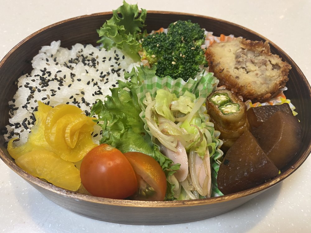 豚バラとオクラの包み焼+煮込み過ぎた大根+野菜炒め+吉岡精肉さんのコロッケ⤴⤴