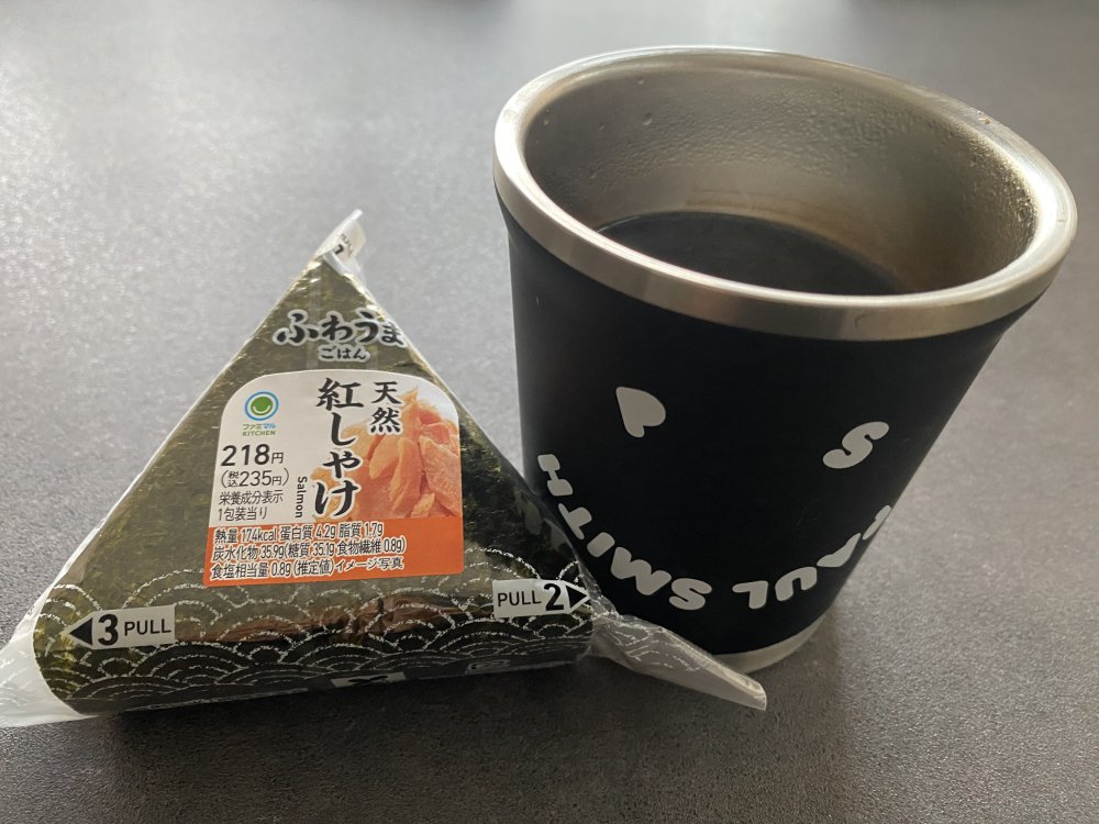 紅シャケのおにぎりとモーニングコーヒー(/ω\)