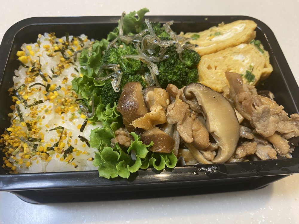 親鳥、油揚げ、椎茸の炒め物+ネギ入り玉子焼き+ブロッコリーとじゃこのオリーブオイル和え(´▽`*)
