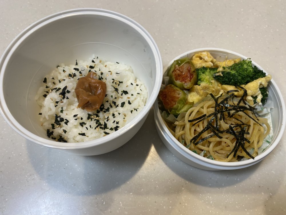 豚肉のキャベツ巻(ロールキャベツ風)+ブロッコリーと卵の中華炒め+たらこパスタ🍱